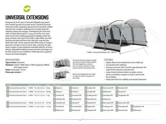 Rozšíření Outwell Universal Extensions jsou silná, stabilní a přizpůsobivá. Vzhledově se hodí ke stávajícím stanům a přidávají velkou spoustu místa do vašeho přístřešku. Má velká okna a otevřenou přední část. Rychle a snadno se dá postavit, připevnění je jednoduché a spolehlivé a transformuje využitelný prostor kolem stanu. Díky možnosti zvednout jednu nebo obě stěny lze přístřešek upravit tak, aby vyhovoval povětrnostním podmínkám.Rychle a snadno se staví i sbalí podle potřebyOcelový rám pro stabilitu dává dostatek místa pro hlavuPevně ​​se připevňuje k hlavnímu stanu, aby vše sedělo a nedostal se dovnitř průvanVelká tónovaná okna tlumí sluneční paprsky, zajišťují soukromí a umožňují táborníkům zůstat v kontaktu s venkovním prostředímVyztužovací záplata na všechny namáhané bodyNastavitelné fixační body pro flexibilitu výšky tónuSvětelná vznášející se upínací lana doplňují elegantní elegantní vzhled stanu Outwell